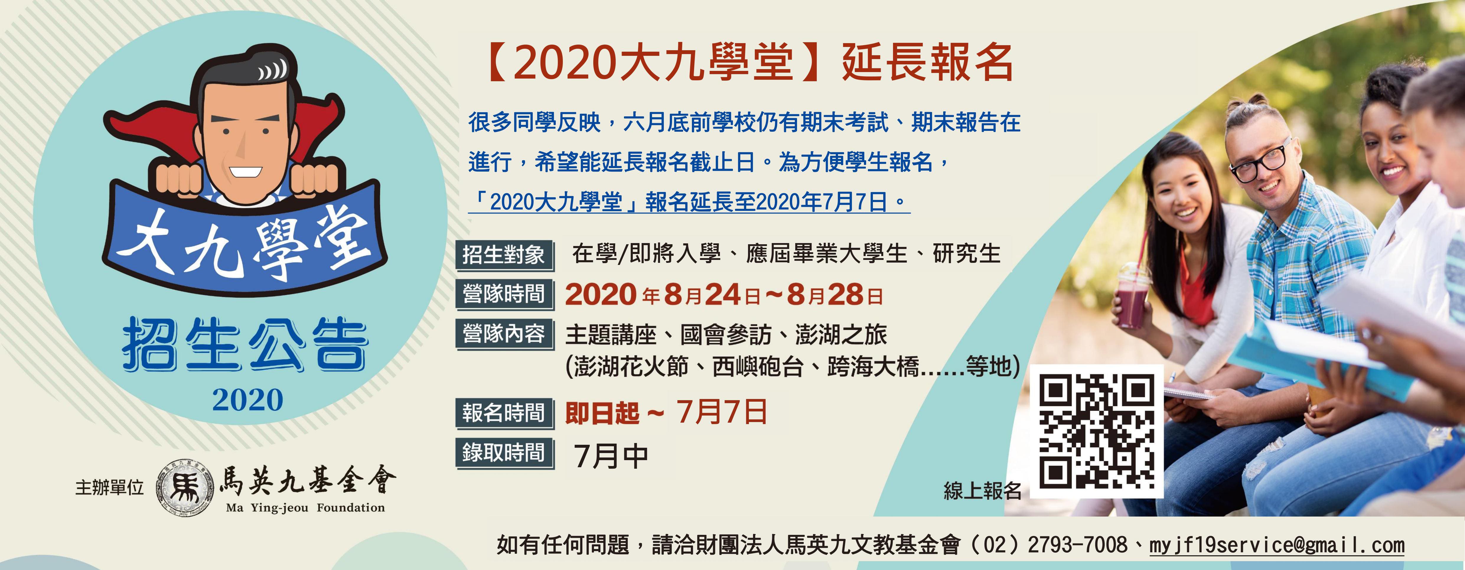 很多同學反映,六月底前學校仍有期末考試、期末報告在進行,希望能延長報名截止日。 為方便學生報名,「2020大九學堂」報名截止日延長至2020年7月7日。歡迎我國在學、即將入學、應屆畢業的大學生、研究生報名參加。